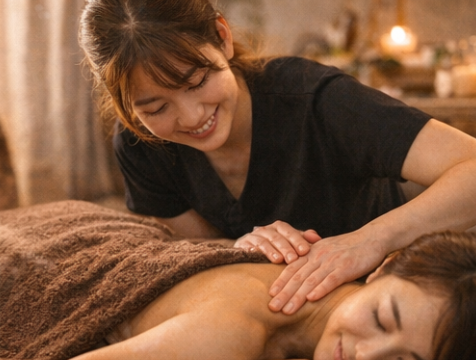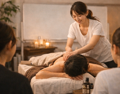 最初は「自分にできるのか不安」と話していましたが、基礎からしっかり学び、3ヶ月後には友人への施術を開始。