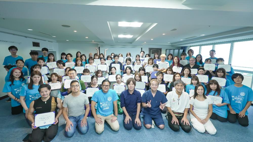 今回参加された方へ、ウェルネスワールドサミットオリジナルタオルと修了証と一緒に集合写真撮影